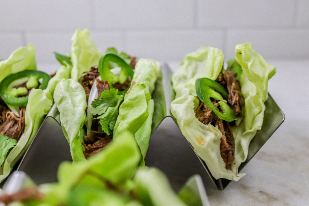 Cook on low for 12-16 hours. Once ready to eat, shred beef. serve in lettuce or tortillas with lime, jalapeño, avocado and cilantro or other toppings you love. Enjoy!